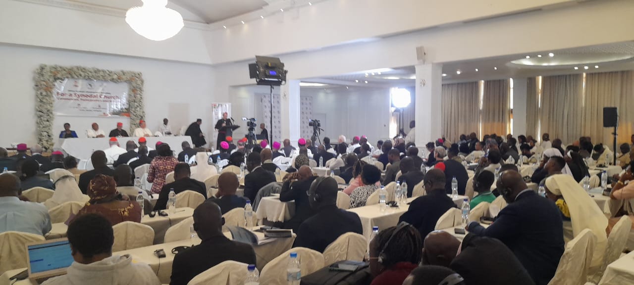 Les travaux de l’assemblée reprennent après notre retour de la cathédrale (et après le petit-déjeuner !). Une première rédaction du document final est présentée : sa première partie porte sur les étapes antérieures à la rencontre continentale et sa préparation ; la deuxième sur les intuitions et tensions exprimées par les participants ; une 3ème et dernière partie sur les priorités qui pourraient être proposées au travail des évêques en octobre. Les participants se retrouvent en carrefours pour réagir sur ce qui leur semble manquer ou devoir être reformulé dans la troisième partie. L’après-midi, une nouvelle rédaction est présentée. Le débat est animé. Le Rapporteur général du Synode sur la Synodalité soulignera avec humour qu’il manifeste que l’Église d’Afrique est bien vivante ! L’atmosphère se tend un peu quand, dans les questions pastorales qui se posent, sont évoquées les questions d’orientation sexuelle. Certains s’opposent fermement, les mêmes qui avaient dénoncé le DEC comme un instrument de pression exercée par les sociétés occidentales pour changer l’Église, parce qu’il y avait dans le document la mention des LGBTQ parmi les personnes stigmatisées et marginalisées. La question est clivante dans l’assemblée, certains soutenant que la question n’existe pas en Afrique.